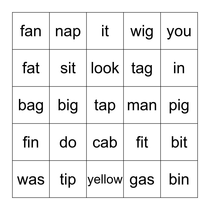 This bingo card has 25 words: do, yellow, look, was, you, fan, fat, nap, man, cab, tag, bag, fit, bit, sit, bin, pig, it, in, big, tap, tip, fin, wig and gas.