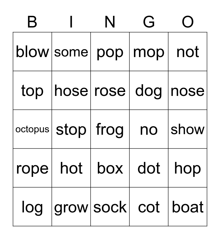 This bingo card has a free space and 24 words: hot, grow, rose, log, not, blow, top, some, no, box, dog, octopus, dot, hop, hose, cot, show, pop, nose, stop, boat, rope, mop and sock.