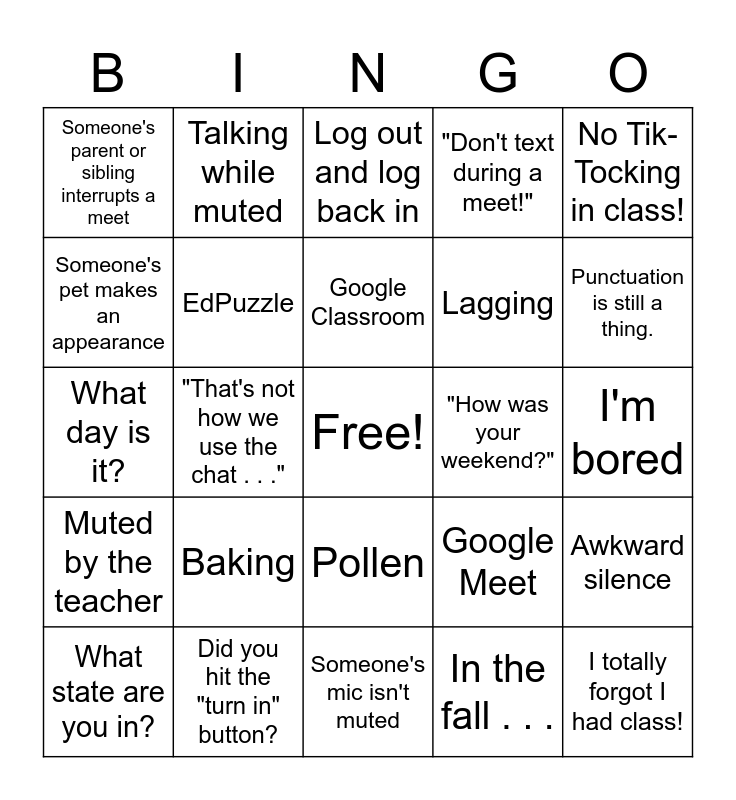 This bingo card has a free space and 27 words: Google Meet, Biking, Lagging, Someone's mic isn't muted, Someone's pet makes an appearance, Log out and log back in, Talking while muted, Muted by the teacher, "How was your weekend?", Awkward silence, What day is it?, "Don't text during a meet!", What state are you in?, Did you hit the "turn in" button?, Punctuation is still a thing., BrainPop, EdPuzzle, Google Classroom, Baking, Someone's parent or sibling interrupts a meet, I'm bored, In the fall . . ., "That's not how we use the chat . . .", I totally forgot I had class!, Pollen, No Tik-Tocking in class! and What are you eating?.