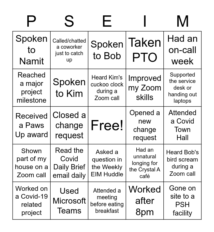 This bingo card has a free space and 29 words: Worked on a Covid-19 related project, Attended DCR, Closed a change request, Explained how to use a Zoom feature to a coworker, Spoken to Namit, Spoken to Bob, Spoken to Kim, Read the Covid Daily Brief email daily, Opened a new change request, Used Microsoft Teams, Attended a Covid Town Hall, Gone on site to a PSH facility, Attended a meeting before eating breakfast, Worked after 8pm, Supported the service desk or handing out laptops, Cancelled a meeting due to Covid priorities, Asked a question in the Weekly EIM Huddle, Shown part of my house on a Zoom call, Had an on-call week, Received a Paws Up award, Had an unnatural longing for the Crystal A café, Missed Bob's biweekly meetings when they were cancelled, Improved my Zoom skills, Reached a major project milestone, Taken PTO, Called/chatted a coworker just to catch up, Heard Bob's bird scream during a Zoom call, Heard Kim's cuckoo clock during a Zoom call and Entered a Service Desk ticket.