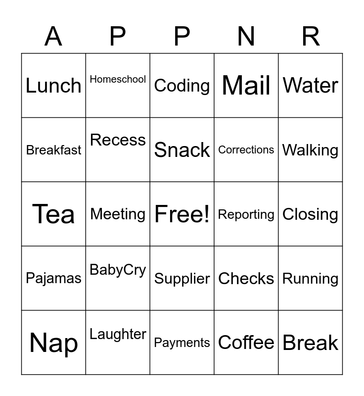 This bingo card has a free space and 24 words: Nap, BabyCry, Snack, Coffee, Water, Lunch, Homeschool, Coding, Reporting, Closing, Tea, Recess, Checks, Running, Breakfast, Laughter, Payments, Mail, Walking, Pajamas, Meeting, Supplier, Corrections and Break.