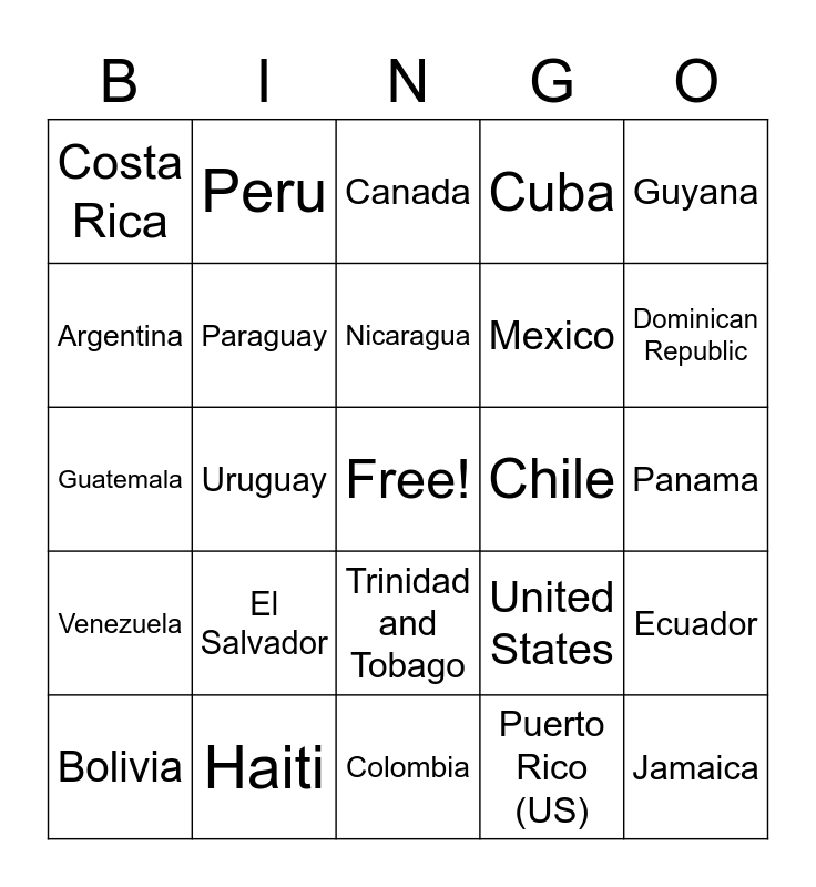 This bingo card has a free space and 27 words: United States, Brazil, Mexico, Colombia, Argentina, Canada, Peru, Venezuela, Chile, Ecuador, Guatemala, Cuba, Bolivia, Haiti, Dominican Republic, Honduras, Paraguay, Nicaragua, El Salvador, Costa Rica, Panama, Puerto Rico (US), Uruguay, Jamaica, Trinidad and Tobago, Guyana and Suriname.