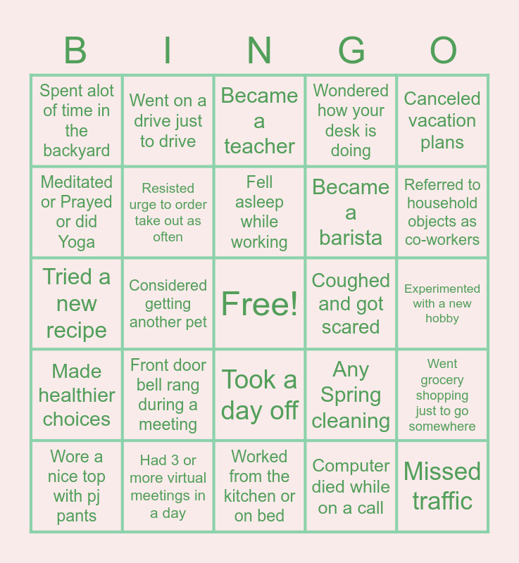 This bingo card has a free space and 34 words: Missed Cafe Robbia, Computer died while on a call, Deeply effected by weather changes, Had a family game night, Made healthier choices, Resisted urge to order take out as often, Canceled vacation plans, Wore a nice top with pj pants, Went on a drive just to drive, Ate virtual lunch with a coworker, Fell asleep while working, Became a teacher, Cuddled pets while working, Made a commuting joke, Coughed and got scared, Referred to household objects as co-workers, Had 3 or more virtual meetings in a day, Tried a new recipe, Front door bell rang during a meeting, Any Spring cleaning, Took a day off, Treated yourself $, Spent alot of time in the backyard, Experimented with a new hobby, Worked from the kitchen or on bed, Missed traffic, Wondered how your desk is doing, Missed the candy on the supplies cabinets, Became a barista, Meditated or Prayed or did Yoga, Wore no makeup for days, Considered getting another pet, Went grocery shopping just to go somewhere and Read too much news and regretted it.
