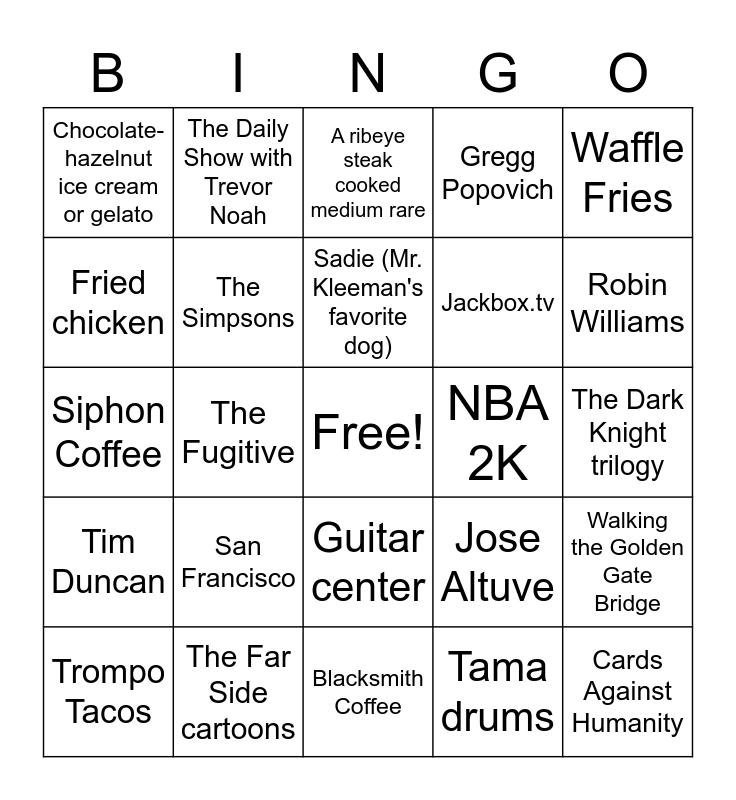 This bingo card has a free space and 84 words: San Antonio Spurs, The Salt Lick BBQ, A ribeye steak cooked medium rare, Houston Astros, The Beatles, New York City, Pluckers Trivia Shepherd, Houston Rockets, Paris, Franklin BBQ, SCP-3008, Nirvana, The Simpsons, NBA 2K, Nutella, Chocolate-hazelnut ice cream or gelato, Trompo Tacos, Fried chicken, Willie Mae's Scotch House, Raising Cane's, Stephen King books, Jackbox.tv, Cards Against Humanity, Poetry, The Fugitive, Independence Day (the movie), Perry's Steakhouse famous pork chop, You (his students), El Tiempo filet fajitas, Mala Sichuan Bistro, San Francisco, Antidote and Black Hole coffee houses, Javaman Coffee, Siphon Coffee, Hugo's, Backstreet Cafe, Blacksmith Coffee, Honda Accord, Robin Williams, Tim Duncan, Manu Ginobili, Tony Parker, James Harden, Hakeem Olajuwon, Tour de France, Last Week Tonight with John Oliver, The Daily Show with Trevor Noah, U2, Rock concerts so loud I can't hear correctly for a week, Cold brew with cream, Ferrero Rocher, Jose Altuve, Gregg Popovich, Katherine Smith Elementary, The color black, Bad puns, The Far Side cartoons, Sadie (Mr. Kleeman's favorite dog), Wii Sports bowling, The Dark Knight trilogy, Popcorn loaded with melted butter, Bebop jazz, Miles Davis, Tom Hanks, Denzel Washington, Leonardo DiCaprio, Newspapers, Little Jimmy's Deli, Waffle Fries, Long walks on the beach, Walking the Golden Gate Bridge, Darwin award winners, Foreign language films, Spurs HEB Commercials, Guitar center, Tama drums, Taco Tuesday at Tacos A Go-Go, The Empire State Building observation deck at night, Clocks by Coldplay, Songs in A-flat, Bill Nye The Science Guy, 94.5 The Buzz, Hermann Park and The IT Crowd.
