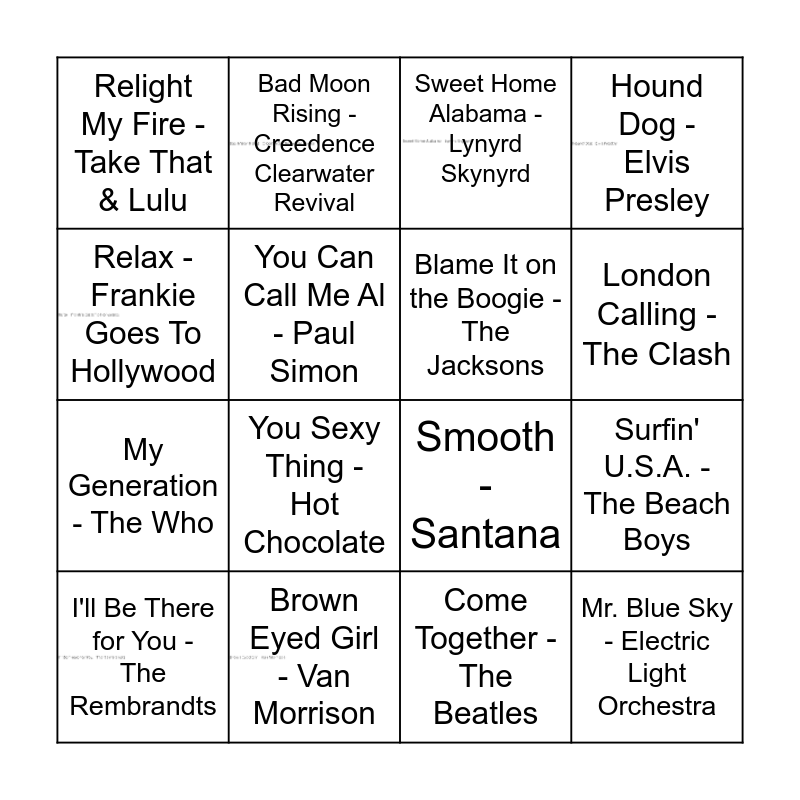 This bingo card has 6 images and 16 words: I'll Be There for You - The Rembrandts, Brown Eyed Girl - Van Morrison, Sweet Home Alabama - Lynyrd Skynyrd, Hound Dog - Elvis Presley, Relax - Frankie Goes To Hollywood, Bad Moon Rising - Creedence Clearwater Revival, Smooth - Santana, Surfin' U.S.A. - The Beach Boys, Relight My Fire - Take That & Lulu, You Can Call Me Al - Paul Simon, Come Together - The Beatles, London Calling - The Clash, My Generation - The Who, You Sexy Thing - Hot Chocolate, Blame It on the Boogie - The Jacksons and Mr. Blue Sky - Electric Light Orchestra.