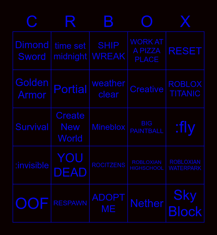 This bingo card has a free space and 24 words: YOU DEAD, RESPAWN, weather clear, OOF, RESET, Dimond Sword, Golden Armor, time set midnight, BIG PAINTBALL, ROCITZENS, Creative, Survival, ROBLOXIAN HIGHSCHOOL, ROBLOXIAN WATERPARK, Portial, Nether, :fly, SHIP WREAK, ROBLOX TITANIC, Create New World, Sky Block, :invisible, WORK AT A PIZZA PLACE and ADOPT ME.