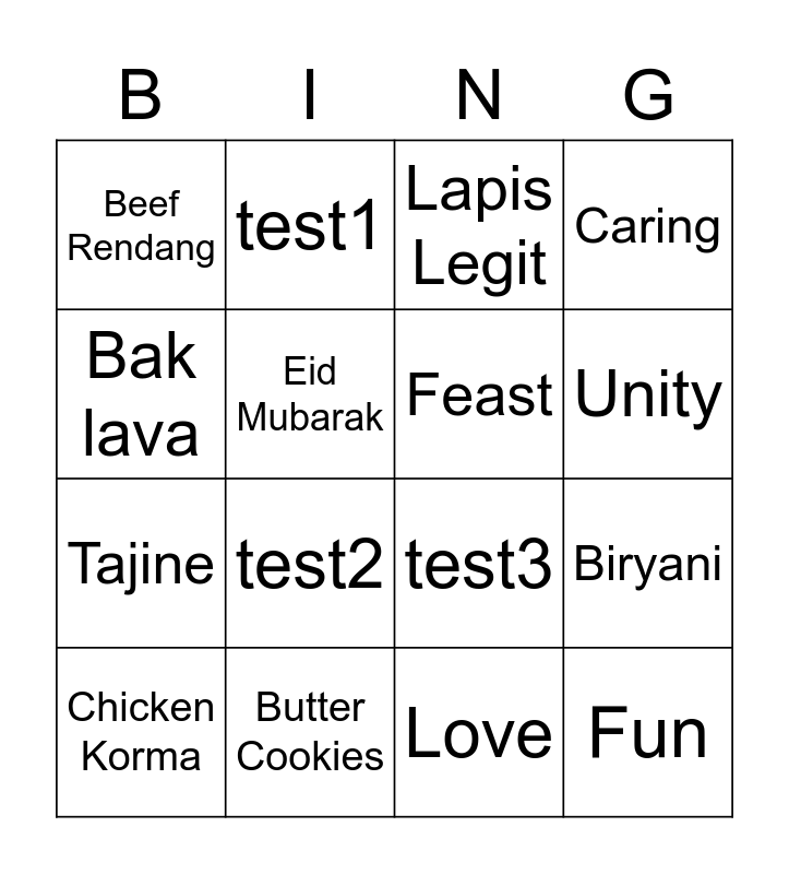 This bingo card has 20 words: Biryani, Boolani, Lapis Legit, Sheer Kurma, Chicken Korma, Bak lava, Butter Cookies, Beef Rendang, Tajine, test1, test2, test3, Eid Mubarak, Fun, Feast, Charity, Unity, Caring, Love and Community.