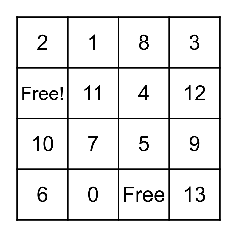 This bingo card has 16 words: 0, 9, 8, 2, 10, 1, 5, Free, Free!, 11, 6, 3, 7, 12, 4 and 13.