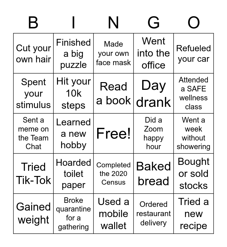 This bingo card has a free space and 29 words: Gained weight, Adopted or fostered an animal, Learned a new hobby, Took care of kids, Cut your own hair, Made your own face mask, Hit your 10k steps, Hoarded toilet paper, Did a Zoom happy hour, Broke quarantine for a gathering, Went a week without showering, Tried a new recipe, Used a mobile wallet, Ordered restaurant delivery, Attended a SAFE wellness class, Watched The Tiger King, Completed the 2020 Census, Tried Tik-Tok, Refueled your car, Sent a meme on the Team Chat, Baked bread, Got tested for COVID-19, Day drank, Spent your stimulus, Went into the office, Finished a big puzzle, Bought or sold stocks, Read a book and Wrote an old fashioned letter.