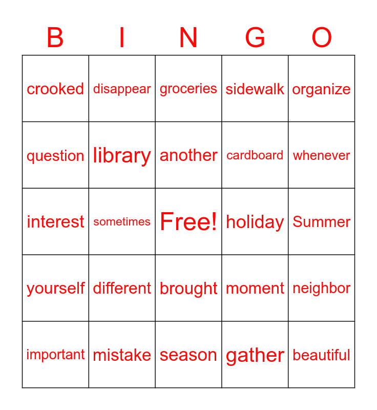 This bingo card has a free space and 24 words: important, different, another, gather, organize, crooked, disappear, groceries, holiday, Summer, interest, library, moment, neighbor, question, mistake, season, sidewalk, whenever, yourself, sometimes, brought, cardboard and beautiful.
