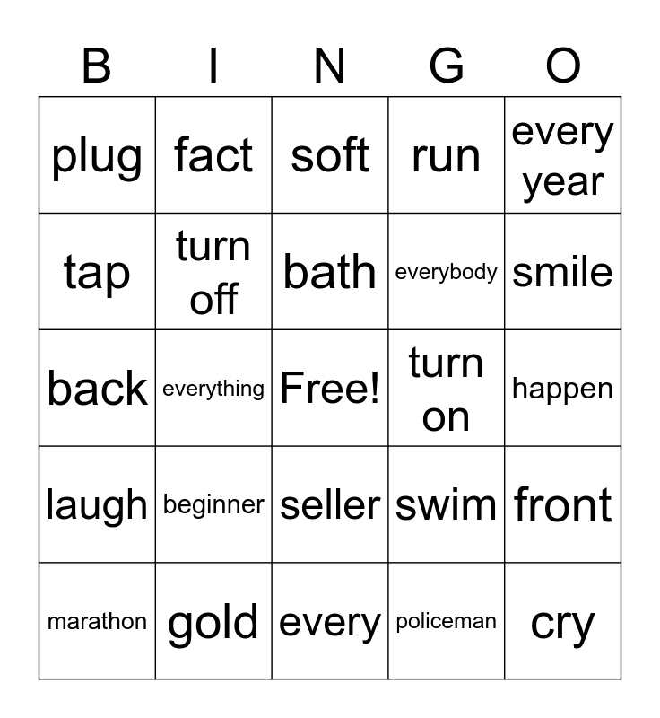 This bingo card has a free space and 39 words: sponge, weekend, every day, turn off, marathon, seller, bath, hairdresser, every year, laugh, everything, run, cry, happen, turn on, beginner, everywhere, plug, enjoy, swim, tap, every, everybody, smile, still, opinion, for, hard, silver, fact, how long, since, soft, gold, policeman, police station, front, back and side.