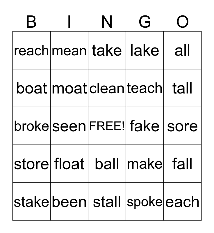 This bingo card has a free space and 24 words: float, been, clean, stake, all, reach, boat, mean, fake, ball, teach, broke, make, fall, moat, spoke, sore, take, tall, seen, each, store, lake and stall.