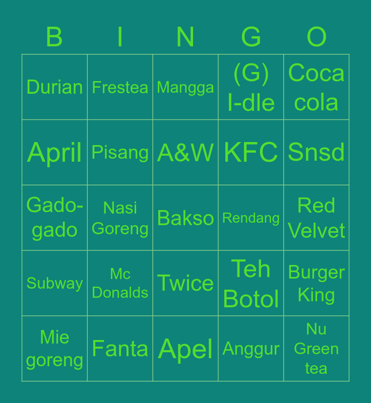 This bingo card has 25 words: Mc Donalds, Apel, A&W, Mie goreng, Coca cola, Durian, April, Frestea, Rendang, Twice, KFC, Gado-gado, Teh Botol, Burger King, Pisang, Nu Green tea, Red Velvet, Mangga, Snsd, Nasi Goreng, Bakso, Fanta, Subway, (G) I-dle and Anggur.