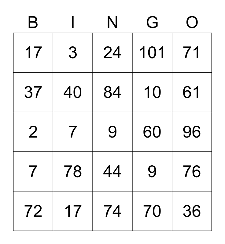 This bingo card has 125 words: 1, 2, 3, 4, 5, 6, 7, 8, 9, 10, 11, 12, 13, 14, 15, 16, 17, 18, 19, 20, 30, 40, 50, 60, 1, 2, 3, 4, 5, 6, 7, 8, 9, 10, 11, 12, 13, 14, 15, 16, 17, 18, 19, 20, 21, 22, 23, 24, 25, 26, 27, 28, 29, 30, 31, 32, 33, 34, 35, 36, 37, 38, 39, 40, 41, 42, 43, 44, 45, 46, 47, 48, 49, 50, 51, 52, 53, 54, 55, 56, 57, 58, 59, 60, 61, 62, 63, 64, 65, 66, 67, 68, 69, 70, 71, 72, 73, 74, 75, 76, 77, 78, 79, 80, 81, 82, 83, 84, 85, 86, 87, 88, 89, 90, 91, 92, 93, 94, 95, 96, 97, 98, 99, 101 and 108.