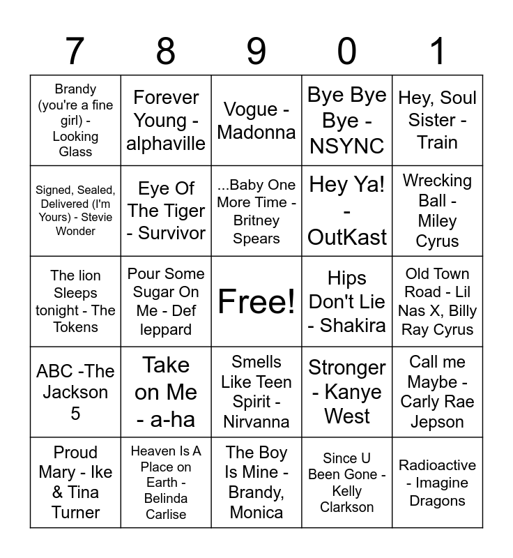 This bingo card has a free space and 49 words: My Sharona - The Knack, Billie Jean - Michael Jackson, Barbie Girl - Aqua, Since U Been Gone - Kelly Clarkson, Old Town Road - Lil Nas X, Billy Ray Cyrus, Ain't no mountain high enough - Diana Ross, Forever Young - alphaville, No Scrubs - TLC, Hey Ya! - OutKast, Rolling In The Deep - Adele, Signed, Sealed, Delivered (I'm Yours) - Stevie Wonder, Pour Some Sugar On Me - Def leppard, Stronger - Kanye West, Radioactive - Imagine Dragons, Lean on me - Bill Withers, Purple Rain - Prince, Vogue - Madonna, Hips Don't Lie - Shakira, Closer - The Chainsmokers, Brandy (you're a fine girl) - Looking Glass, Heaven Is A Place on Earth - Belinda Carlise, The Boy Is Mine - Brandy, Monica, Bye Bye Bye - NSYNC, Hey, Soul Sister - Train, Heaven must be missing an angel - Tavares, Take on Me - a-ha, ...Baby One More Time - Britney Spears, Umbrella - Rihanna & JAY-Z, Call me Maybe - Carly Rae Jepson, ABC -The Jackson 5, Fast Car - Tracey Chapman, Smells Like Teen Spirit - Nirvanna, Bad Romance - Lady Gaga, Happy - Pharell, Proud Mary - Ike & Tina Turner, Ghostbusters - Ray Parker Jr., Ironic - Alanis morisette, Single Ladies - Beyonce, Wrecking Ball - Miley Cyrus, American pie - Don Mclean, Never Gonna Give you Up - Rick Astley, My Heart Will Go On -Titanic, Mr. Brightside - The Killers, Hot Line Bling - Drake, The lion Sleeps tonight - The Tokens, Eye Of The Tiger - Survivor, It wasn't me - Shaggy, Low - Flow Rida and Blank Space - Taylor Swift.