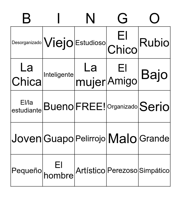 This bingo card has a free space and 31 words: Artístico, Atlético, Bueno, Cómico, Desorganizado, Estudioso, Inteligente, Malo, Organizado, Perezoso, Serio, Simpático, Trabajador, Alto, Bajo, Bonito, Grande, Guapo, Joven, Pelirrojo, Rubio, Castaño, Pequeño, Viejo, El Amigo, La Chica, El Chico, El/la estudiante, El hombre, La mujer and La persona.