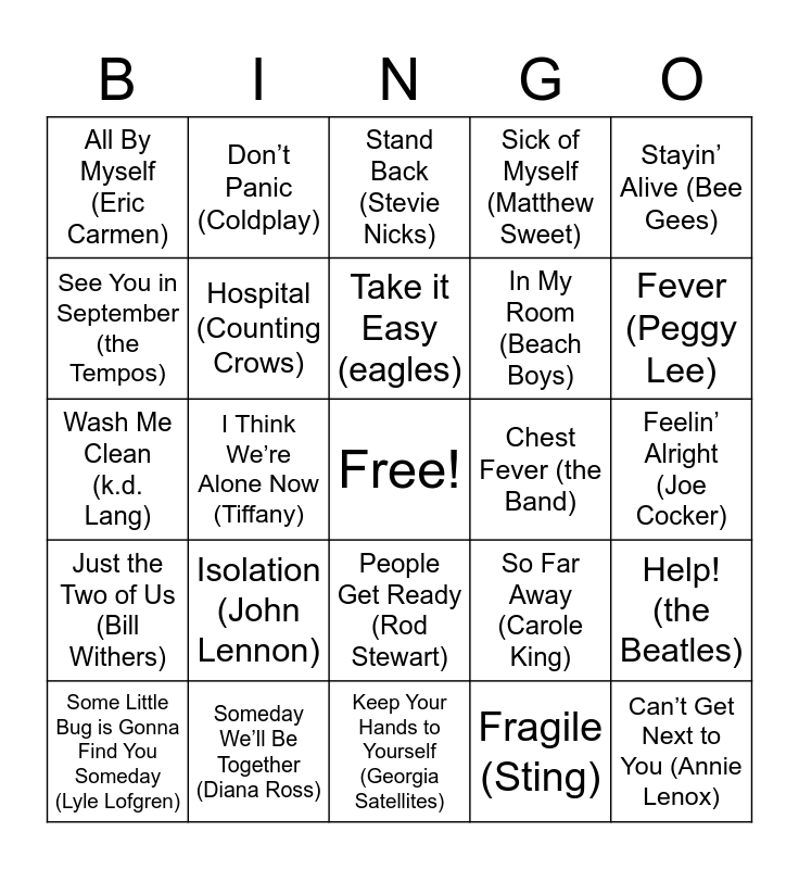This bingo card has a free space and 64 words: What’s Going On (Marvin Gaye), It’s the End of the World as We Know It (REM), Strange Days (the Doors), Help! (the Beatles), Lean on Me (Bill Withers), A Change is Gonna Come (Otis Redding), Don’t Panic (Coldplay), Don’t Think Twice, It’s Alright (Bob Dylan), Take it Easy (eagles), Don’t Stop Thinking About Tomorrow (Fleetwood Mac), People Get Ready (Rod Stewart), Little Things Mean a Lot (Kitty Kallen), Feelin’ Alright (Joe Cocker), Stayin’ Alive (Bee Gees), I’ll Be Seeing You (Frank Sinatra), See You in September (the Tempos), I Think We’re Alone Now (Tiffany), All By Myself (Eric Carmen), I Will Survive (Gloria Gaynor), In My Room (Beach Boys), Isolation (John Lennon), Just the Two of Us (Bill Withers), Sick of Myself (Matthew Sweet), Every Day is Exactly the Same (Nine Inch Nails), Gimme Shelter (Rolling Stones), You Ain’t Goin’ Nowhere (Bob Dylan), Jigsaw Puzzle (Rolling Stones), Every Breath You Take (The Police), It’s Not My Time to Go (Dan Hicks), You Be Illin’ (Run DMC), Who Can it Be Now? (Men at Work), Behind the Mask (Fleetwood Mac), Heal Me (Snow Patrol), Down with Disease (Phish), Fever (Peggy Lee), Some Little Bug is Gonna Find You Someday (Lyle Lofgren), Ventilator Blues (Rolling Stones), Fragile (Sting), Hey 19 (Steely Dan), Hospital (Counting Crows), Wash Me Clean (k.d. Lang), Chest Fever (the Band), I Want a New Drug (Huey Lewis and the News), Run to the Hills (Iron Maiden), Don’t Stand So Close to Me (The Police), Can’t Get Next to You (Annie Lenox), Someday We’ll Be Together (Diana Ross), Long Distance Runaround (Yes), So Far Away (Carole King), Can’t Touch This (MC Hammer), Get Back! (Beatles), I Hear You Knockin’, but You Can’t Come In (Little Richard), Keep Your Hands to Yourself (Georgia Satellites), Walk Away Renee (the Left Banke), From a Distance (Bette Midler), Beat It (Michael Jackson), Stand Back (Stevie Nicks), Walk on By (Dionne Warwick), Tired of Being Alone (Al Green), Alone Again, Naturally (Gilbert O’Sullivan), Dancing with Myself (Billy Idol), I’m So Lonesome I Could Cry (Hank Williams), Alone Together (Fall Out Boy) and We’re All Alone (Boz Skaggs).