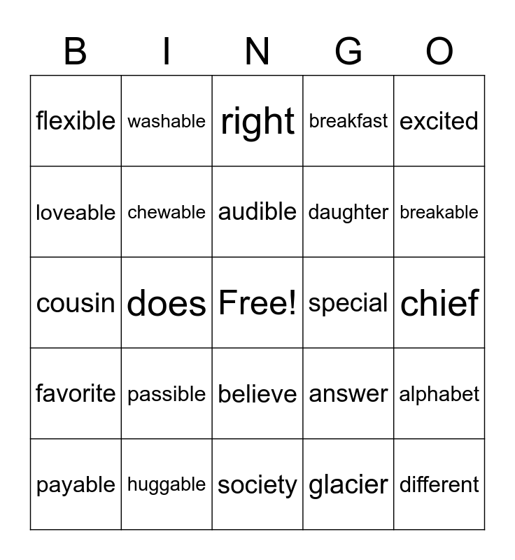 This bingo card has a free space and 24 words: passible, huggable, audible, payable, excited, flexible, loveable, washable, special, believe, daughter, cousin, answer, alphabet, chewable, glacier, chief, right, breakable, does, different, favorite, breakfast and society.