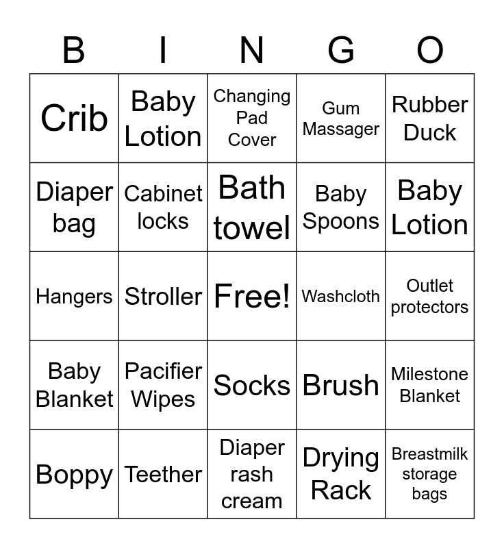 This bingo card has a free space and 73 words: Plush bunny, Rocking Chair, Crib, Crib mattress, Mattress Cover, Crib Sheet, Baby Blanket, Receiving Blanket, Brush, Comb, Pacifier, Gas relief drops, Cabinet locks, Outlet protectors, Baby Bath wash, Baby Lotion, Diaper rash cream, Diaper bag, Baby bathtub, Washcloth, Bath towel, Gum Massager, Rubber Duck, High Chair, Boppy, Carrier, Booster Seat, Baby gate, Car seat toy, Rattle, Teether, Stroller Orrganzier, Shampoo Rinser, Bottle Warmer, Stroller, Car Seat, Bottles, Bottle brush set, Breastmilk storage bags, Bibs, Drying Rack, Pacifier Wipes, Baby Wipes, Diapers, Changing pad, Baby Spoons, Changing Pad Cover, Nursing cover, Hamper, Hangers, Books, Bookshelf, Thermometer, Onsie, Sleeper, Clothing, Jacket, Socks, Newborn Lounger, Baby Swing, Dresser, Car Seat Base, Crib Sheet, Baby Lotion, Baby Shoes, Gift Card, Hat, Bathrobe, Milestone Blanket, Nail Clipper, Nursery Cam, Humidifier and Nursery Decor.