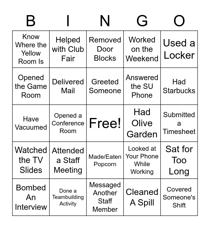 This bingo card has a free space and 29 words: Bombed An Interview, Filled out a Direct Pay, Opened a Conference Room, Been in a Supply Closet, Know Where the Yellow Room Is, Removed Door Blocks, Delivered Mail, Attended a Staff Meeting, Had Olive Garden, Done a Teambuilding Activity, Submitted a Timesheet, Covered Someone's Shift, Messaged Another Staff Member, Cleaned A Spill, Had Starbucks, Been to the Bookstore, Made/Eaten Popcorn, Watched the TV Slides, Used a Locker, Have Vacuumed, Looked at Your Phone While Working, Been to Panda/Rowdy's, Answered the SU Phone, Opened the Game Room, Worked on the Weekend, Helped with Club Fair, Sat for Too Long, Greeted Someone and Played Bingo.
