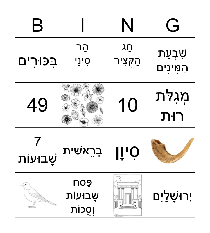 This bingo card has 8 images and 16 words: סַל, מְגִלַּת רוּת, מַאַכְלֵי חָלָב, 49, בִּכּוּרִים, הַר סִינַי, פָּסַח שָׁבוּעוֹת וְסֻכּוֹת, 7 שָׁבוּעוֹת, סִיוָן, דְּבַשׁ, 10, חַג הַקָּצִיר, בְּרֵאשִׁית, יְרוּשָׁלַיִם, שִׁבְעַת הַמִּינִים and יוֹם אֶחָד.