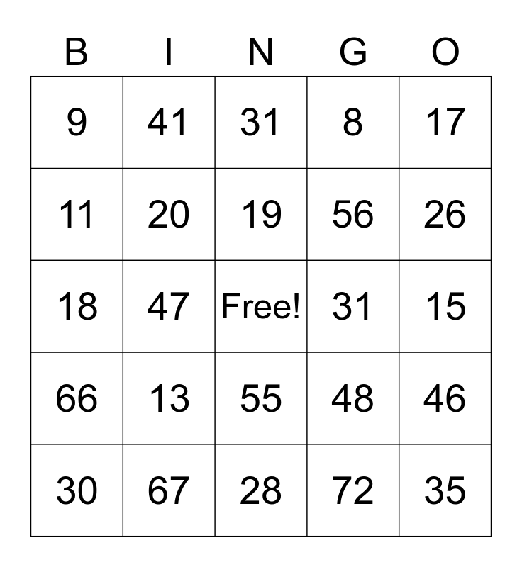 This bingo card has a free space and 80 words: 1, 16, 31, 46, 61, 1, 2, 3, 4, 5, 6, 7, 8, 9, 10, 11, 12, 13, 14, 15, 16, 17, 18, 19, 20, 21, 22, 23, 24, 25, 26, 27, 28, 29, 30, 31, 32, 33, 34, 35, 36, 37, 38, 39, 40, 41, 42, 43, 44, 45, 46, 47, 48, 49, 50, 51, 52, 53, 54, 55, 56, 57, 58, 59, 60, 61, 62, 63, 64, 65, 66, 67, 68, 69, 70, 71, 72, 73, 74 and 75.