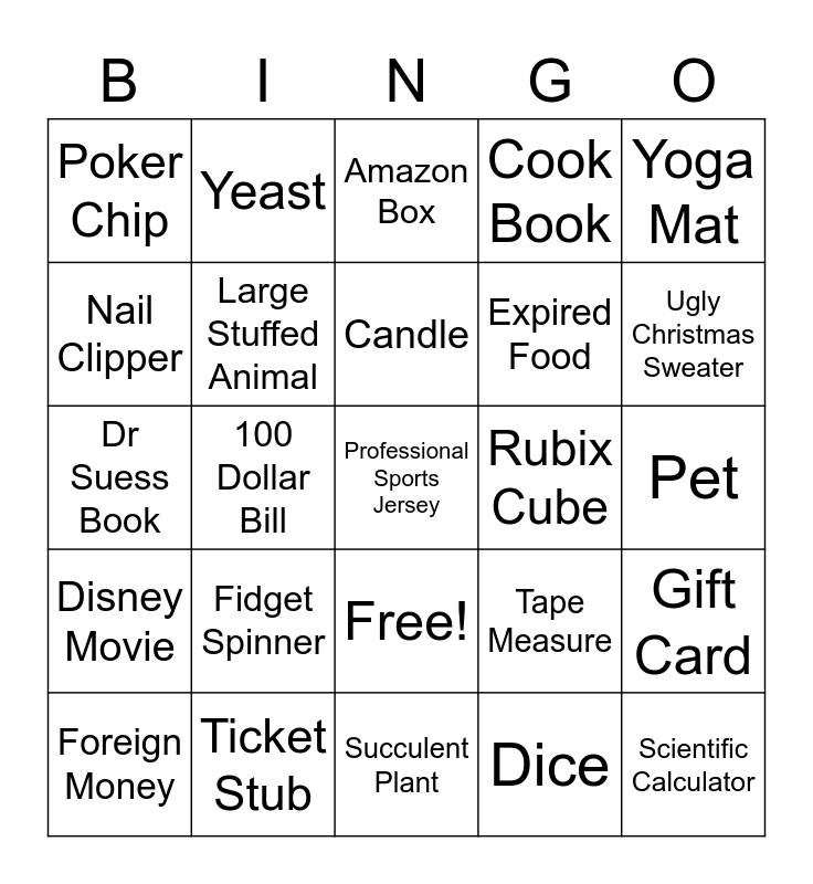 This bingo card has 26 words: Free!, Dice, Candle, Ticket Stub, Yoga Mat, Poker Chip, Nail Clipper, Yeast, Pet, Tape Measure, Expired Food, Dr Suess Book, Gift Card, Foreign Money, 100 Dollar Bill, To Go Menu, Cook Book, Disney Movie, Amazon Box, Professional Sports Jersey, Ugly Christmas Sweater, Succulent Plant, Rubix Cube, Fidget Spinner, Large Stuffed Animal and Scientific Calculator.