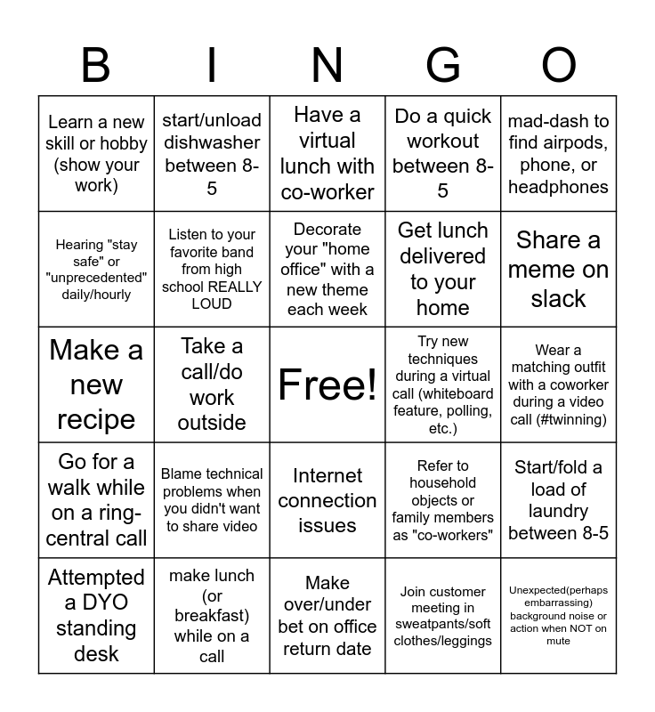 This bingo card has a free space and 24 words: Blame technical problems when you didn't want to share video, make lunch (or breakfast) while on a call, Decorate your "home office" with a new theme each week, Attempted a DYO standing desk, mad-dash to find airpods, phone, or headphones, Learn a new skill or hobby (show your work), Hearing "stay safe" or "unprecedented" daily/hourly, start/unload dishwasher between 8-5, Try new techniques during a virtual call (whiteboard feature, polling, etc.), Internet connection issues, Get lunch delivered to your home, Make a new recipe, Refer to household objects or family members as "co-workers", Start/fold a load of laundry between 8-5, Listen to your favorite band from high school REALLY LOUD, Join customer meeting in sweatpants/soft clothes/leggings, Wear a matching outfit with a coworker during a video call (#twinning), Have a virtual lunch with co-worker, Share a meme on slack, Take a call/do work outside, Unexpected(perhaps embarrassing) background noise or action when NOT on mute, Go for a walk while on a ring-central call, Do a quick workout between 8-5 and Make over/under bet on office return date.