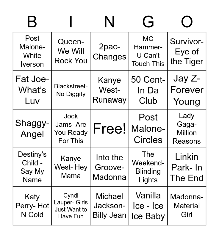 This bingo card has a free space and 24 words: Kanye West- Hey Mama, Cyndi Lauper- Girls Just Want to Have Fun, Kanye West- Runaway, Katy Perry- Hot N Cold, Survivor- Eye of the Tiger, Post Malone- White Iverson, Fat Joe- What’s Luv, Queen- We Will Rock You, Post Malone- Circles, Into the Groove- Madonna, 50 Cent- In Da Club, Shaggy- Angel, The Weekend- Blinding Lights, Linkin Park- In The End, Blackstreet- No Diggity, Vanilla Ice - Ice Ice Baby, Lady Gaga- Million Reasons, 2pac- Changes, Jay Z- Forever Young, Jock Jams- Are You Ready For This, Madonna- Material Girl, Destiny's Child - Say My Name, MC Hammer- U Can't Touch This and Michael Jackson- Billy Jean.