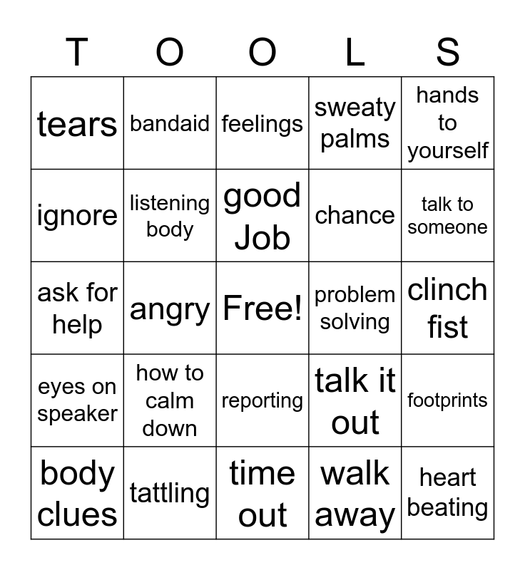 This bingo card has a free space and 29 words: body clues, put ups, angry, deep breath, tears, feelings, listening body, how to calm down, problem solving, tattling, clinch fist, heart beating, time out, walk away, talk to someone, apologize, reporting, eyes on speaker, hands to yourself, ask for help, talk it out, compromise, chance, ignore, sweaty palms, bandaid, footprints, good Job and put downs.