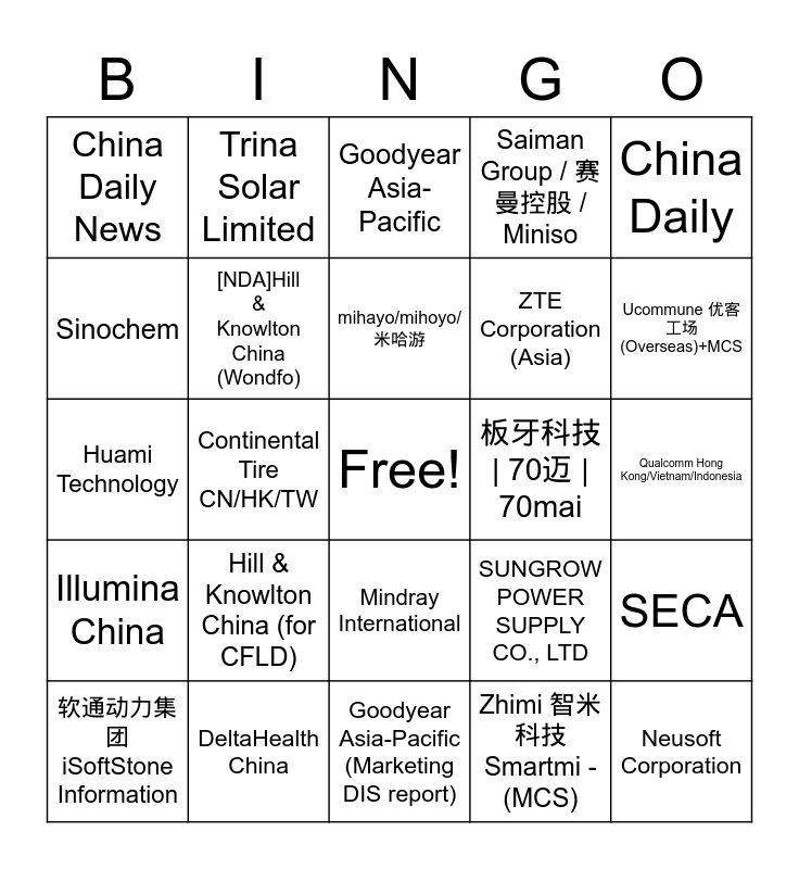 This bingo card has a free space and 26 words: Mindray International, Zhimi 智米科技 Smartmi - (MCS), mihayo/mihoyo/米哈游, DeltaHealth China, China Daily, China Daily News, Sinochem, Trina Solar Limited, Qualcomm Hong Kong/Vietnam/Indonesia, SUNGROW POWER SUPPLY CO., LTD, ZTE Corporation (Asia), Huami Technology, SECA, 软通动力集团iSoftStone Information, Continental Tire CN/HK/TW, Fonterra China 恒天然, Saiman Group / 赛曼控股 / Miniso, Illumina China, Goodyear Asia-Pacific, Neusoft Corporation, Ucommune 优客工场 (Overseas)+MCS, Goodyear Asia-Pacific (Marketing DIS report), 板牙科技 | 70迈 | 70mai, Hill & Knowlton China (for CFLD), [NDA]Hill & Knowlton China (Wondfo) and Peking University.