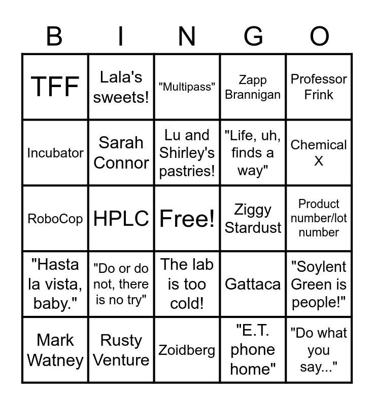 This bingo card has a free space and 68 words: "Say what you do...", "Do what you say...", "Record it!", Daniel's Amazing Cheesecake!, "Video! Video!", "Can we move the due date?", Lala's sweets!, "It's the equipment.", Lu and Shirley's pastries!, "We have until 11:59", The lab is too cold!, The lab is too hot, Product number/lot number, Professor Frink, We have a leak!, Incubator, HPLC, TFF, "Ah, what a fine day for science!", "Do or do not, there is no try", "Life, uh, finds a way", Gattaca, "Hasta la vista, baby.", “I’m sorry Dave, I'm afraid I can't do that”, "I know Kung Fu", "COME ON, TARS!", "Set phasers to stun", "I'll be back", "Soylent Green is people!", "Don't panic", "Multipass", "There is no spoon", "Negative, I am a meat popsicle", "To infinity, and beyond!", Zapp Brannigan, Marty McFly, Ellen Ripley, Mark Watney, Chemical X, RoboCop, "The cake is a lie", HAL 9000, Sarah Connor, Rick Deckard, Agent Scully, Agent Mulder, Professor Farnsworth, Snake Plissken, Ziggy Stardust, Rusty Venture, Intergalactic Planetary, Bill nye the science guy, Admiral Ackbar, Zoidberg, Area 51, Continuum Transfunctioner, "E.T. phone home", Dr. Manhattan, Rick and Morty, Breaking Bad, Space Oddity, "Calm your horses!", "For whatever XoY reason", "Sprayballs", "Britney", "Jamie", "Protein A" and "Extra Credits".