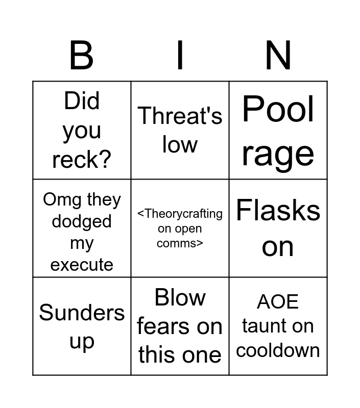 This bingo card has a free space and 8 words: Flasks on, Pool rage, Threat's low, Sunders up, Did you reck?, AOE taunt on cooldown, Omg they dodged my execute and Blow fears on this one.