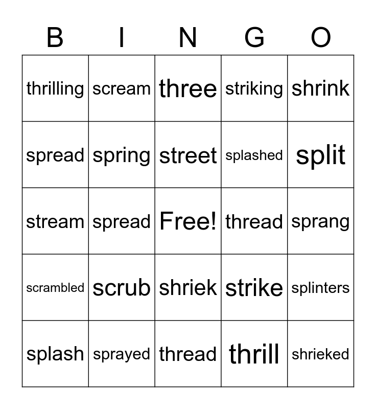 This bingo card has a free space and 24 words: scrub, sprayed, street, splash, shrink, thrilling, spread, scream, thread, shriek, splashed, stream, strike, splinters, spring, thrill, sprang, three, split, spread, shrieked, scrambled, striking and thread.