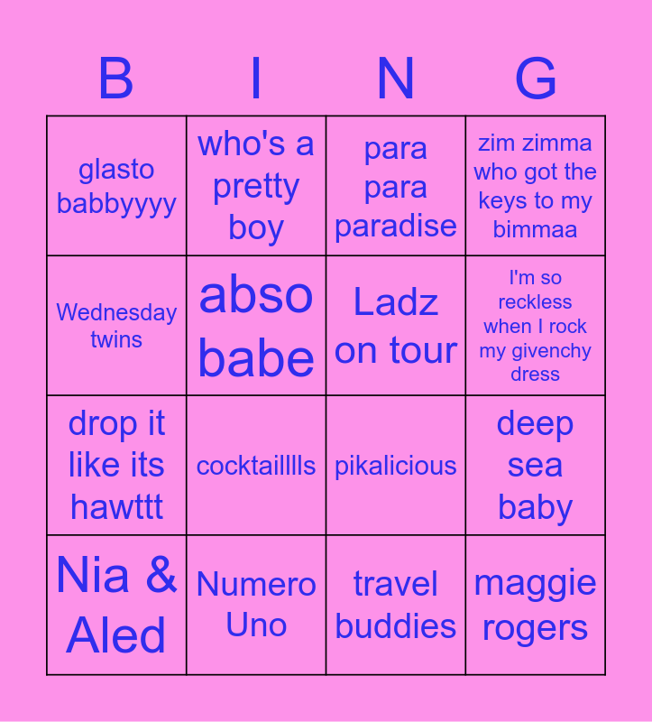 This bingo card has 19 words: pikalicious, Maxwell, para para paradise, maggie rogers, deep sea baby, Wednesday twins, travel buddies, glasto babbyyyy, who's a pretty boy, drop it like its hawttt, cocktailllls, abso babe, Ladz on tour, Numero Uno, Nia & Aled, Legend, zim zimma who got the keys to my bimmaa, I'm so reckless when I rock my givenchy dress and be my egg and I will be your egg.