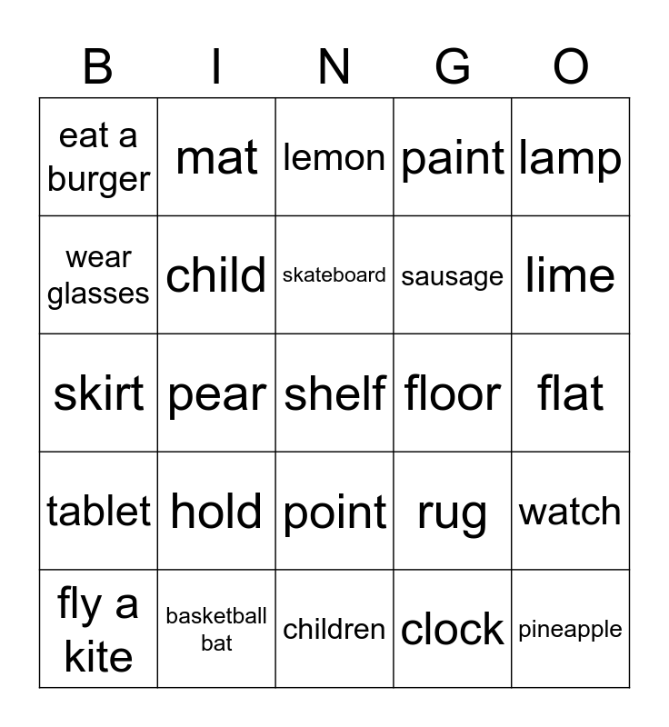 This bingo card has a free space and 24 words: hold, basketball bat, skateboard, fly a kite, lamp, eat a burger, wear glasses, mat, floor, point, sausage, skirt, rug, watch, child, clock, flat, lemon, lime, pear, pineapple, tablet, paint and children.