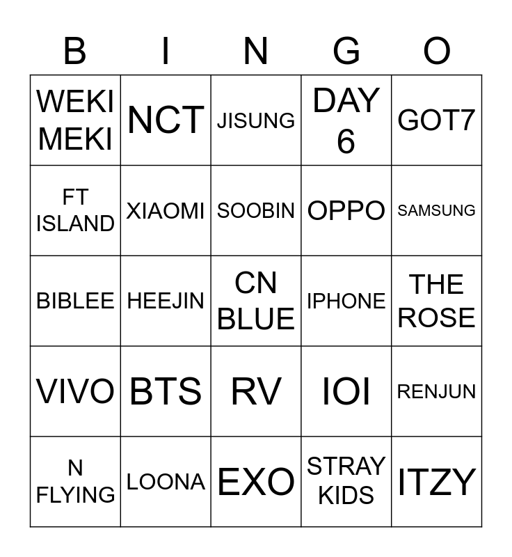 This bingo card has a free space and 24 words: BTS, LOONA, SOOBIN, N FLYING, GOT7, WEKI MEKI, FT ISLAND, NCT, IPHONE, RV, OPPO, BIBLEE, IOI, RENJUN, XIAOMI, STRAY KIDS, THE ROSE, JISUNG, SAMSUNG, HEEJIN, ITZY, VIVO, DAY 6 and EXO.