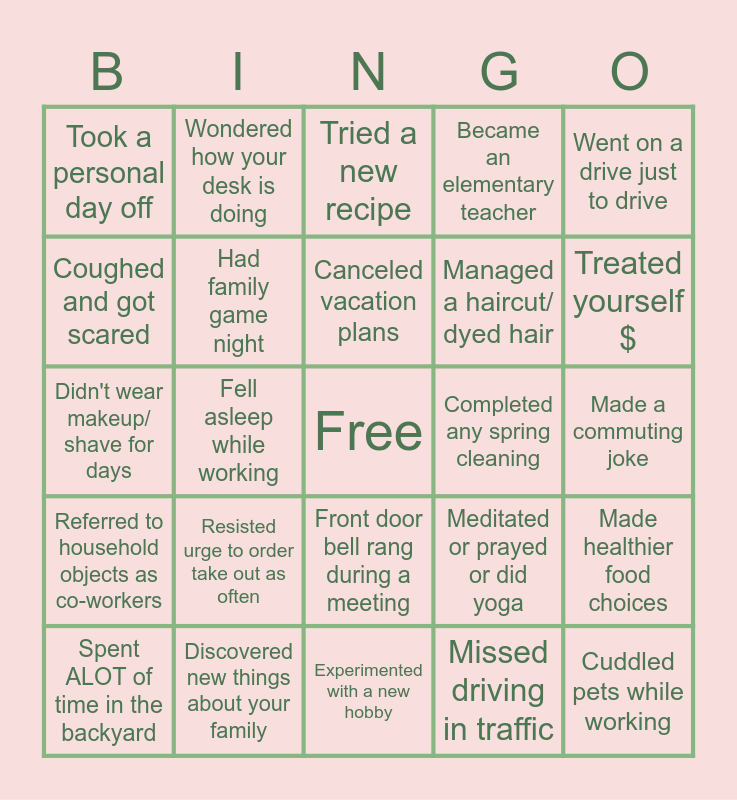 This bingo card has a free space and 37 words: Missed Cafe Robbia food or even just bubbly, Computer died while on a call, Has become deeply effected by weather changes, Had family game night, Made healthier food choices, Resisted urge to order take out as often, Canceled vacation plans, Wore a decent top but with pj pants, Went on a drive just to drive, Ate virtual lunch with a coworker, Fell asleep while working, Became an elementary teacher, Cuddled pets while working, Made a commuting joke, Coughed and got scared, Referred to household objects as co-workers, Had 3 or more virtual meetings in a day, Tried a new recipe, Front door bell rang during a meeting, Completed any spring cleaning, Took a personal day off, Treated yourself $, Spent ALOT of time in the backyard, Experimented with a new hobby, Wore pajamas the whole day, Missed driving in traffic, Wondered how your desk is doing, Missed the candy on the supplies cabinets, Became a barista, Read too much news and regretted it, Considered becoming a gardener, Discovered new things about your family, Didn't wear makeup/ shave for days, Considered adopting a new pet, Meditated or prayed or did yoga, Managed a haircut/ dyed hair and Went grocery shopping to mostly just get out of the house.