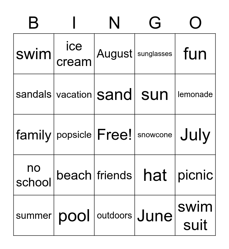 This bingo card has a free space and 24 words: beach, pool, sand, summer, fun, swim, sandals, ice cream, snowcone, friends, sun, family, hat, picnic, vacation, June, July, August, lemonade, popsicle, swim suit, no school, sunglasses and outdoors.