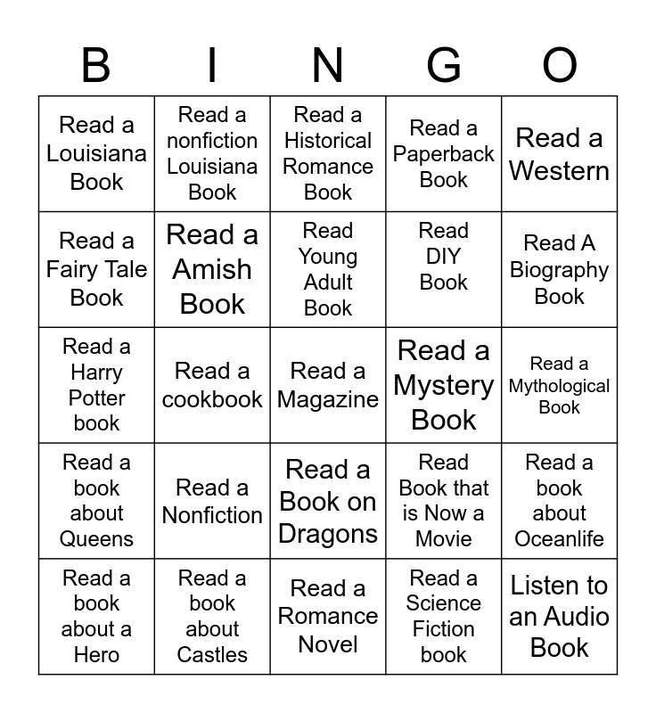 This bingo card has a free space and 24 words: Read a Nonfiction, Read a book about Castles, Read Young Adult Book, Read a book about a Hero, Read a Western, Read a Louisiana Book, Read a Fairy Tale Book, Read a nonfiction Louisiana Book, Read a Mystery Book, Read a Book on Dragons, Read DIY Book, Read a Harry Potter book, Read Book that is Now a Movie, Read a book about Oceanlife, Read a Amish Book, Read a Science Fiction book, Read a Mythological Book, Read a Historical Romance Book, Read A Biography Book, Read a cookbook, Listen to an Audio Book, Read a book about Queens, Read a Paperback Book and Read a Romance Novel.