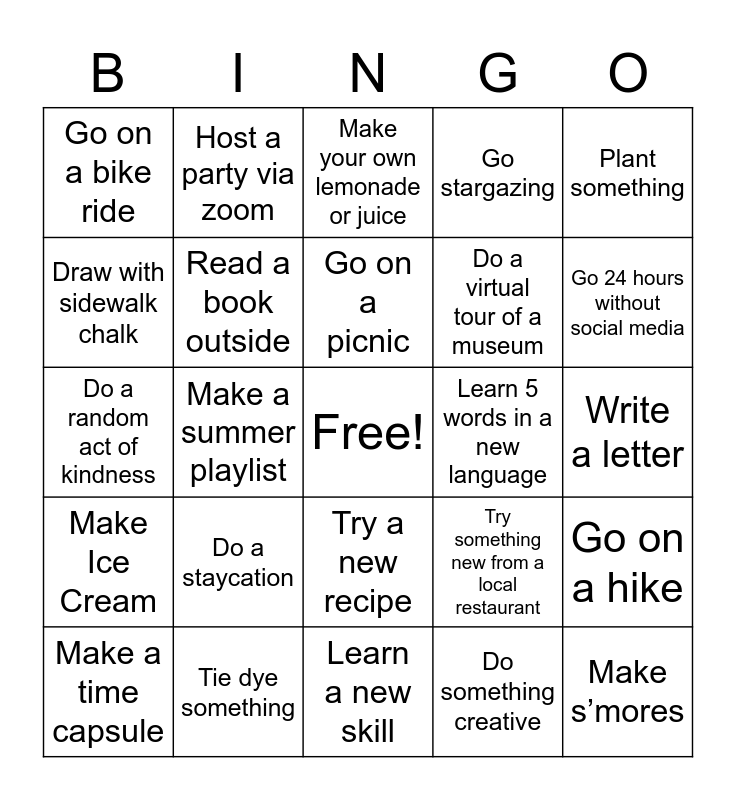 This bingo card has a free space and 24 words: Do a staycation, Tie dye something, Go on a picnic, Make a time capsule, Plant something, Go on a bike ride, Draw with sidewalk chalk, Host a party via zoom, Learn 5 words in a new language, Try a new recipe, Do a virtual tour of a museum, Do a random act of kindness, Try something new from a local restaurant, Go on a hike, Read a book outside, Do something creative, Write a letter, Make your own lemonade or juice, Go 24 hours without social media, Make a summer playlist, Make s’mores, Make Ice Cream, Go stargazing and Learn a new skill.