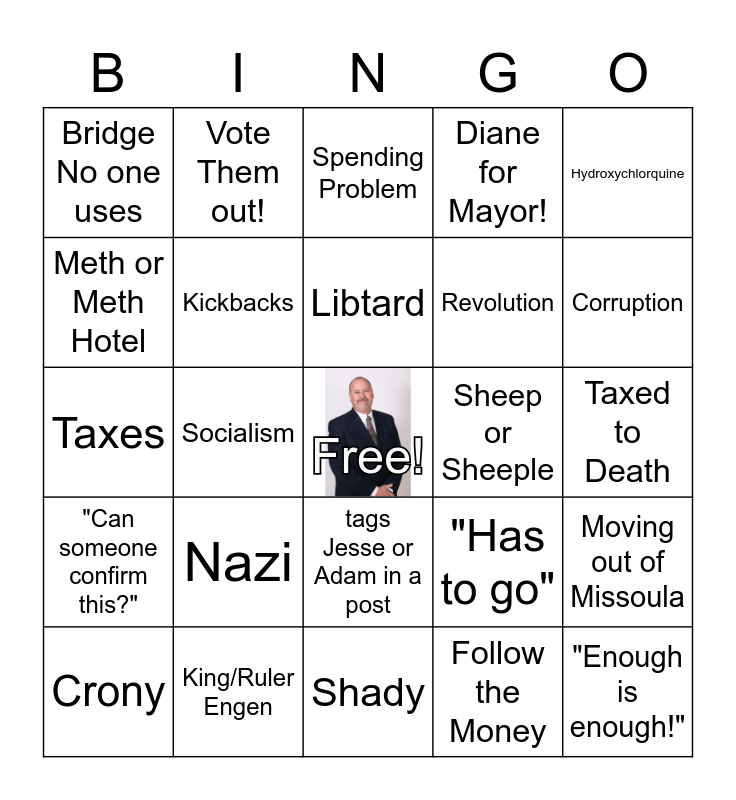 This bingo card has a free space and 24 words: Nazi, King/Ruler Engen, Libtard, Crony, Hydroxychlorquine, Bridge No one uses, Meth or Meth Hotel, Vote Them out!, Sheep or Sheeple, tags Jesse or Adam in a post, Revolution, Taxes, "Has to go", Moving out of Missoula, Kickbacks, Follow the Money, Taxed to Death, Spending Problem, Corruption, Socialism, "Enough is enough!", "Can someone confirm this?", Diane for Mayor! and Shady.