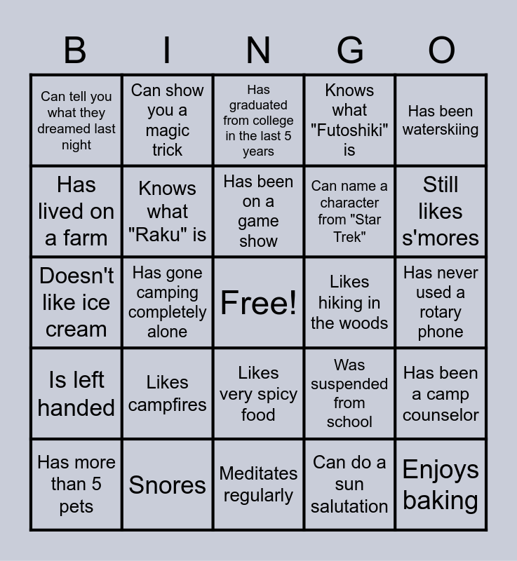 This bingo card has a free space and 48 words: Can speak more than 3 languages, Enjoys baking, Can play more than one musical instrument, Meditates regularly, Likes campfires, Has slept on a beach overnight, Can show you a magic trick, Has milked a cow, Has lived on a farm, Has changed a lightbulb in the last month, Knows what "Raku" is, Knows what "Futoshiki" is, Has been a camp counselor, Was suspended from school, Has been a teacher of any kind, Doesn't have a Facebook page, Has been on a game show, Likes hiking in the woods, Has seen a bear in the wilderness, Has been waterskiing, Has gone camping completely alone, Can do a sun salutation, Can tell you what they dreamed last night, Can name a character from "Star Trek", Has played Pokemon, Still likes s'mores, Has more than 5 pets, Rides a motorcycle, Likes very spicy food, Is left handed, Has a celebrity autograph, Played in a band, Grows herbs, Kills house plants, Snores, Is good at drawing, Is a neat freak, Has never used a rotary phone, Has grandchildren, Loves road trips, Is a night owl (stays up late at night), Has used a typewriter, Has graduated from college in the last 5 years, Doesn't drink coffee, Doesn't like ice cream, Has been on five continents, Wakes up early and Has food allergies.