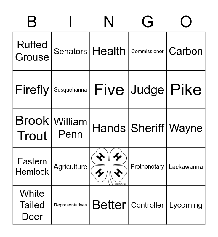 This bingo card has 1 images and 48 words: Mountain Laurel, Representatives, Head, Clerk of Courts, Wayne, White Tailed Deer, Senators, Heart, Commissioner, Northampton, Ruffed Grouse, Susquehanna, Controller, Lehigh, Eastern Hemlock, William Penn, Hands, District Attorney, Carbon, Brook Trout, Liberty Bell, Health, Judge, Monroe, Firefly, Harrisburg, White, Prothonotary, Pike, Great Dane, Mount Davis, Green, Register of Wills, Lackawanna, Milk, Betsey Ross, Doing, Sheriff, Luzerne, Heinz, Better, Treasurer, Centre, Agriculture, Five, Judge, Lycoming and January.