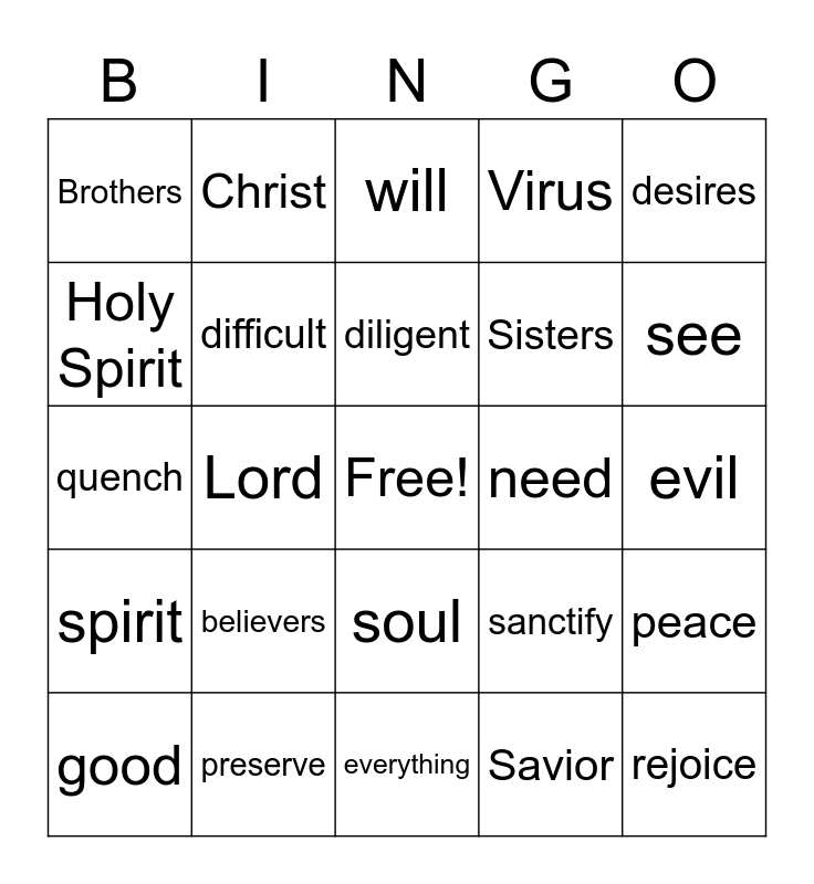 This bingo card has a free space and 47 words: prayer, rejoice, continuous, everything, believers, family, Christ, Jesus, Holy Spirit, work, difficult, Virus, peace, sanctify, faithful, always, diligent, need, wants, desires, Lord, Savior, Brothers, Sisters, church, see, good, body, soul, spirit, whole, care, return, coming, God, preserve, evil, kiss, holy, ceasing, thanksgiving, will, quench, abstain, blameless, wrong and right.