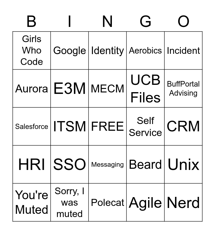 This bingo card has 3 images, a free space and 39 words: JAMF, MECM, Teams, SSO, Agile, Unix, Nerd, Endpoint, Identity, Messaging, CRM, BuffPortal Advising, ITSM, Incident, Request, Beard, COVID, Salesforce, Office365, Google, Aurora, OIM, Registry, Girls Who Code, Meow, Orange, UCB Files, OneDrive, Large File Transfer, Software Packaging, HRI, E3M, Polecat, You're Muted, Sorry, I was muted, Self Service, Self Deployment, Exabyte and Aerobics.