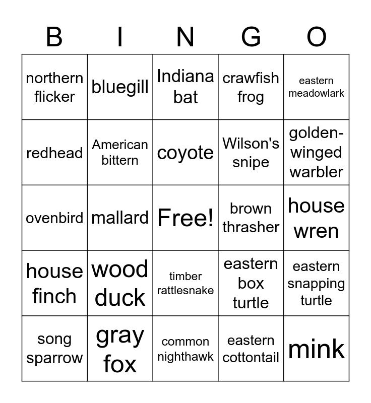 This bingo card has a free space and 34 words: American Bullfrog, eastern cottontail, common muskrat, bobcat, house finch, American bittern, eastern meadowlark, song sparrow, bluegill, largemouth bass, coyote, Indiana bat, American beaver, eastern bluebird, brown thrasher, golden-winged warbler, gray fox, ovenbird, wood duck, eastern box turtle, timber rattlesnake, big brown bat, northern flicker, house wren, common nighthawk, mink, crawfish frog, American woodcock, Wilson's snipe, redhead, northern pintail, mallard, eastern snapping turtle and spotted sandpiper.