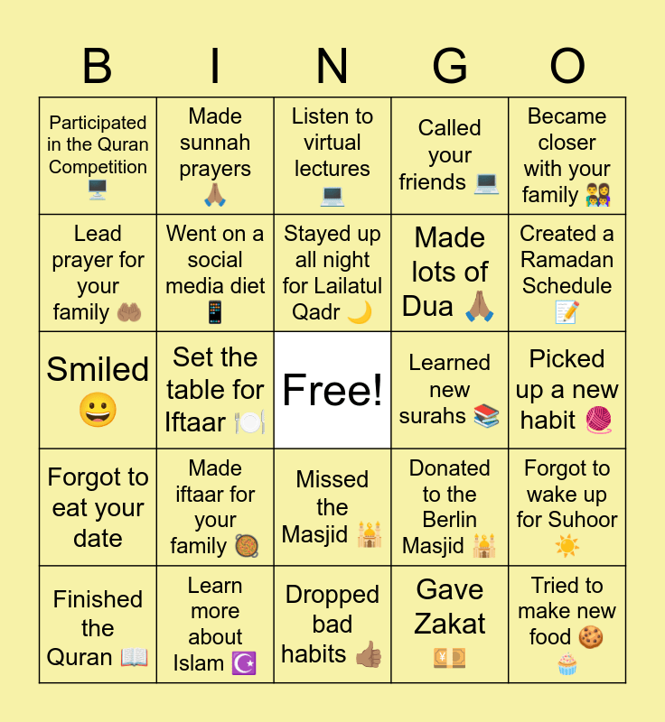 This bingo card has a free space and 24 words: Finished the Quran ๐, Made iftaar for your family ๐ฅ, Stayed up all night for Lailatul Qadr ๐, Gave Zakat ๐ด, Became closer with your family ๐จโ๐ฉโ๐ฆโ๐ฆ, Participated in the Quran Competition ๐ฅ, Made sunnah prayers ๐๐ฝ, Listen to virtual lectures ๐ป, Learned new surahs ๐, Picked up a new habit ๐งถ, Smiled ๐, Went on a social media diet ๐ฑ, Donated to the Berlin Masjid ๐, Forgot to wake up for Suhoor โ๏ธ, Lead prayer for your family ๐คฒ๐ฝ, Learn more about Islam โช๏ธ, Dropped bad habits ๐๐ฝ, Called your friends ๐ป, Created a Ramadan Schedule ๐, Forgot to eat your date, Set the table for Iftaar ๐ฝ, Missed the Masjid ๐, Made lots of Dua ๐๐ฝ and Tried to make new food ๐ช๐ง.