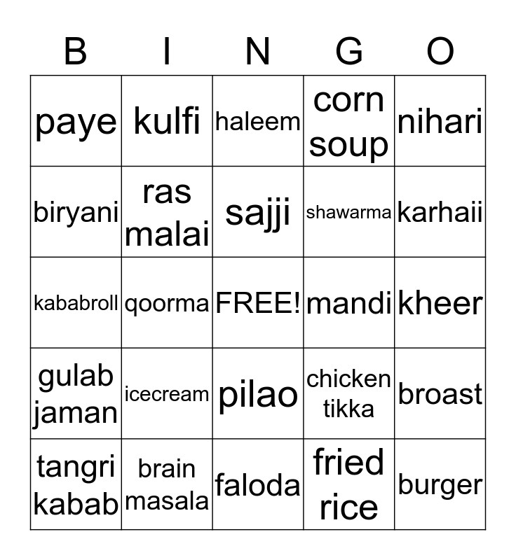 This bingo card has a free space and 24 words: icecream, brain masala, sajji, tangri kabab, nihari, paye, biryani, kulfi, mandi, pilao, shawarma, kababroll, chicken tikka, broast, ras malai, fried rice, kheer, haleem, karhaii, qoorma, burger, gulab jaman, corn soup and faloda.