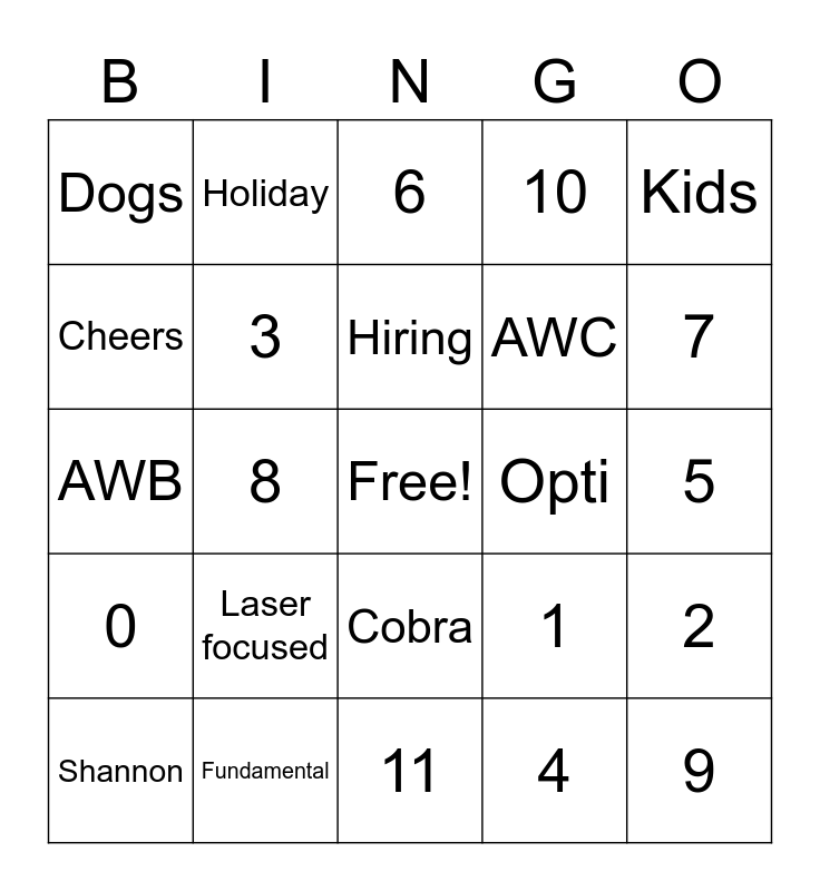 This bingo card has a free space and 24 words: Laser focused, Fundamental, Hiring, Shannon, Kids, Dogs, Cheers, Holiday, Opti, Cobra, AWC, AWB, 1, 2, 3, 4, 5, 6, 7, 8, 9, 0, 10 and 11.
